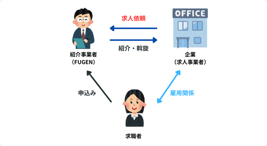 職業紹介とは、職業安定法に基づき、求人者(企業)と求職者(仕事を探す人)の間に立って、雇用関係が成立するよう仲介(あっせん)することです。求職者には仕事のマッチングや